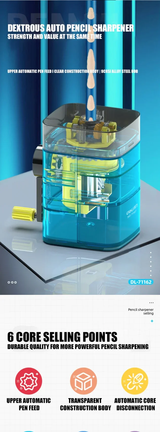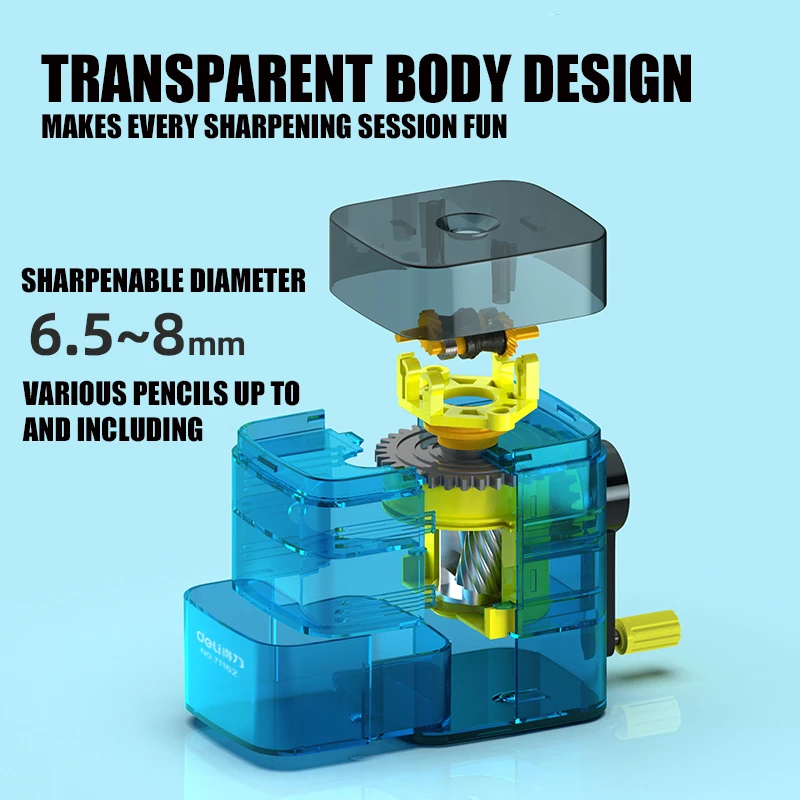 The pencil sharpener is designed with a quality transparent plastic body. The internal structure is visible. Every sharpening is a mechanical collision and friction.